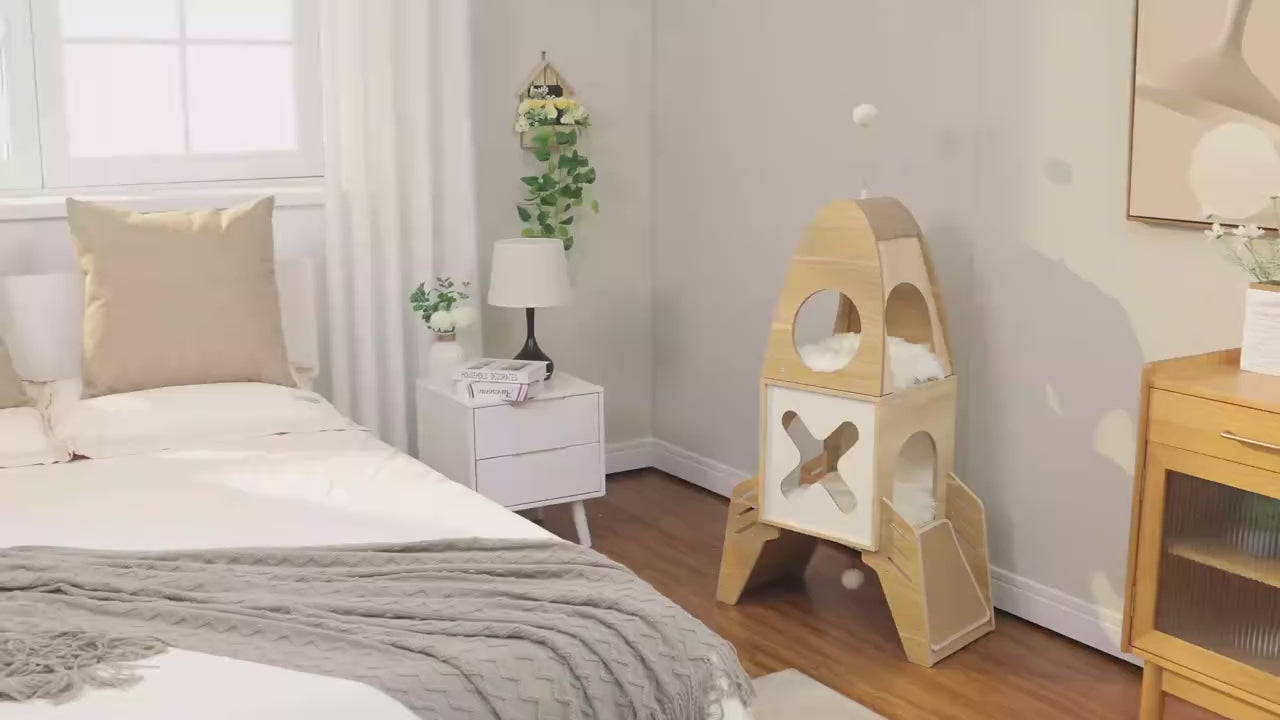 Met de Moderne Kattenboom in Raketvorm geef je je kat niet alleen een speelse plek om te spelen, maar ook een veilige en comfortabele ruimte om te rusten. Dit meubelstuk is de perfecte aanvulling voor elke kattenliefhebber die zijn huis stijlvol en functioneel wil inrichten!