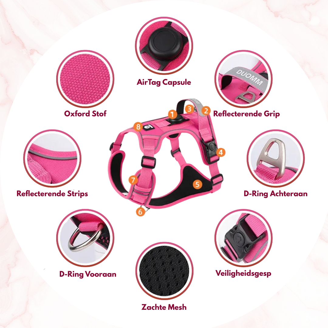 Voor extra gemoedsrust is het tuigje voorzien van een speciale houder voor Apple AirTags (niet inbegrepen), zodat je altijd weet waar je trouwe viervoeter is. Het tuigje is bovendien ook afgewerkt met reflecterende strips, die de zichtbaarheid in het donker verbeteren, waardoor jullie samen veilig op pad kunnen – ook tijdens wandelingen in de avond.